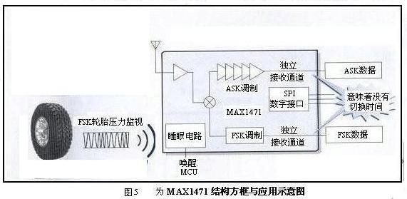 使用MAXl471雙通道接收器同時(shí)捕捉兩種信號(hào),即能同時(shí)接收ASK和FSK(頻率變換數(shù)據(jù)),模式間切換時(shí)間為零。針對(duì)同時(shí)需要對(duì) ASK和FSK解碼的低成本系統(tǒng)設(shè)計(jì),MAXl471雙模接收器還可進(jìn)行自輪詢,器件可保持長(zhǎng)達(dá)8分鐘的睡眠模式,并可喚醒微處理器,以進(jìn)一步節(jié)省能源。 MAXl47l工作于300MHz至450MHz,包括內(nèi)置的42dB(兆型值)鏡頻抑制混頻器,不需常見(jiàn)的SAW濾波器。MAXl471內(nèi)置一個(gè)可用于 3.3V或5V的穩(wěn)壓器,可在低至2.4V的電壓下工作。圖5為MAX1471結(jié)構(gòu)方框與應(yīng)用示意圖,從圖中表看出MAX1471也可用于汽車輪胎壓力監(jiān)視系統(tǒng)中接收器。