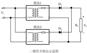 二極管并聯(lián)法如上圖所示:在模塊輸出端接二極管再并聯(lián),這種電源設計方案可以防止輸出電流逆流,形成內環(huán)路。
