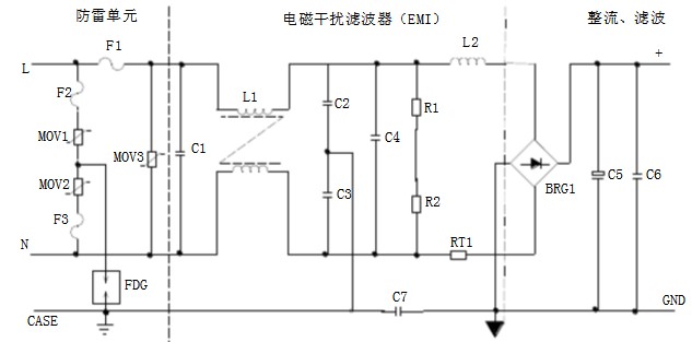 防雷電路:當有雷擊產(chǎn)生高壓經(jīng)過電網(wǎng)進入電源時,由MOV1、MOV2、MOV3和F1、F2、F3、FDG1組成的電路進行保護。當加在壓敏電阻兩端的電壓超過其工作電壓時,其阻值降低,使高壓能量消耗在壓敏電阻上,若電流過大,F1、F2、F3會燒毀保護后級電路。