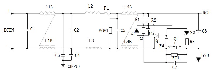 C1、L1、C2組成輸入濾波電路,跟上述的AC輸入濾波電路的作用是一樣的,R1、R2、R3、Z1、C6、Q1、Z2、R4、R5、Q2、RT1、C7組成抗浪涌電路。在起機的瞬間,由于C6的存在Q2不導通,電流經(jīng)RT1構(gòu)成回路。在起機的瞬間電流在RT1上產(chǎn)生的壓降增大,Q1導通使Q2沒有柵極電壓不導通,RT1將會在很短時間燒毀,以保護后級電路。
