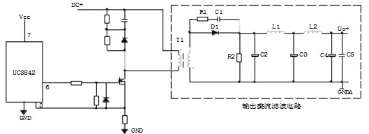 上圖為反激式輸出整流濾波電路:T1為開關(guān)變壓器,其初極和次極的相位相反。D1為整流二極管,R1、C1為削尖峰電路。L1為續(xù)流電感,R2為假負載,C4、L2、C5組成π型濾波器。