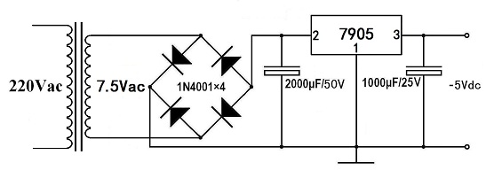 以上為+5V電源模塊的一種方案,下面介紹一種-5V電源的方案。這種方案采用了降壓、整流、濾波、線性穩(wěn)壓器7905,具體電路圖如下所示: