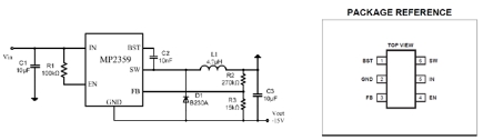 上圖是采用MP2359DT設(shè)計(jì)的-15V電源電路,MP2359DT是采用SOT23-6的封裝,整個(gè)電路占用PCB面積較小。