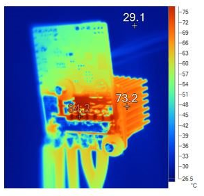 上圖所示為在1kW,36V三相逆變器PCB(36mm×50mm)內(nèi)使用三個CSD88599Q5DC雙冷60V模塊電源測試的頂側(cè)公共散熱器(27mm×27mm×23mm)的結(jié)果,不帶任何氣流。在測試期間,散熱器和功率塊頂殼之間使用具有低熱阻抗(Rθ<0.5°C / W)的電絕緣熱接口。