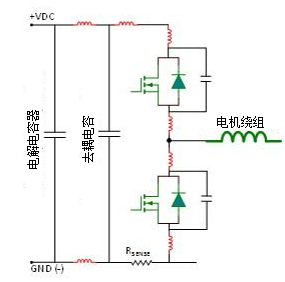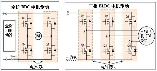 為在兩個方向上驅(qū)動BDC電機(jī),您需要使用兩個半橋(四個金屬氧化物半導(dǎo)體場效應(yīng)晶體管(MOSFET))組成一個全橋。要驅(qū)動三相BLDC電機(jī),需要使用三個半橋(六個MOSFET)組成一個三相逆變器。 使用TI的采用堆疊管芯架構(gòu)的CSD88584Q5DC 和CSD88599Q5DC模塊電源(小型無引線(SON),5mm×6mm封裝),您可通過兩個模塊電源和只帶三個模塊電源的三相BLDC電機(jī)在兩個方向驅(qū)動電機(jī),每個模塊電源連接兩個MOSFET(高側(cè)和低側(cè)MOSFET),組成一個半橋。如下圖所示。