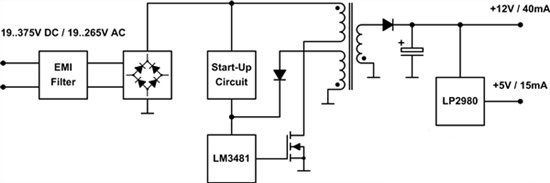 該要求為19至265VAC和19至375VDC的小功率反激式轉(zhuǎn)換器(在500mW的范圍內(nèi)),小功率反激式參考設(shè)計需要具備兩路輸出。一個輸出軌提供微控制器與模擬電路(電流為15mA時電壓為5.0V),另一個輸出軌則在電流為40mA時提供12V的電壓以控制繼電器。因為輸入和兩路輸出需要2.5kV的隔離電壓,所以首先想到了結(jié)構(gòu)簡單、廣為人知的反激式轉(zhuǎn)換器。