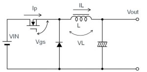 模式幾乎和正激方式相同,只是去掉正激方式的變壓器,將D1換成MOSFET。MOSFET為ON時(shí),電流經(jīng)過(guò)電感流向負(fù)載端,同時(shí)電感也蓄積電能。此時(shí),二極管為OFF。MOSFET為OFF時(shí),蓄積在電感的電能經(jīng)由二極管D2供給至負(fù)載端。和正激轉(zhuǎn)換器的D1相同,開啟或關(guān)閉MOSFET。