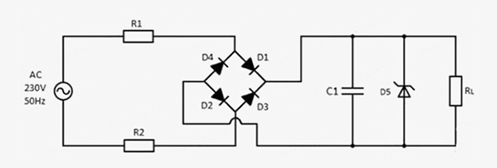 AC-DC電源電阻降壓電路拓?fù)淙缟纤?span>,其中電阻R1是降低大部分輸入電源電壓的關(guān)鍵元件。現(xiàn)在要做的是計(jì)算R1的值以降低電壓,從而在特定電流值下獲得所需的負(fù)載兩端電壓。該電路首先通過(guò)R1分壓,之后通過(guò)橋式整流器將交流電轉(zhuǎn)換為直流電,然后是電容濾波和齊納穩(wěn)壓二極管進(jìn)行穩(wěn)壓輸出。