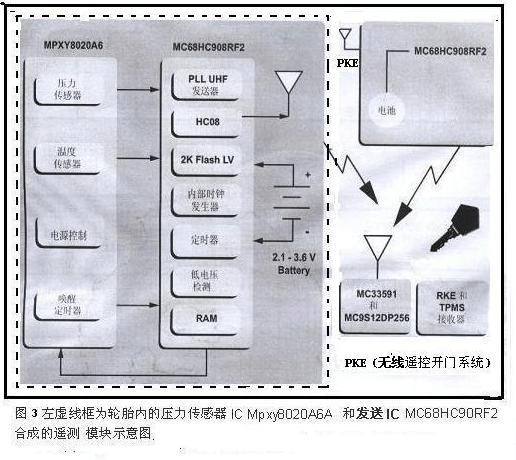 圖3左虛線框?yàn)檩喬?nèi)的壓力傳感器IC和發(fā)送IC為freescale公司的Mpxy8020A6或Mpxy8040A芯片和 MC68HC90RF2芯片。 Mpxy8020A6它內(nèi)含壓力傳感器、溫度傳感器、電源控制和電池電壓檢測(cè),喚醒功能的定時(shí)器,屬表面微機(jī)械CMOS加工工藝,SSOP封裝;而UHF 發(fā)送器+MCU(Flash)的MC68HC90RF2內(nèi)含為2K用戶FLash ROM,定時(shí)器,集成的射頻(RF)發(fā)送器,低電壓檢測(cè)和RAM及內(nèi)部時(shí)鐘發(fā)生器。則整個(gè)圖3左虛線框?yàn)镸pxy8020A6A與MC68HC90RF2 合成的遙測(cè)模塊示意圖。其圖3右側(cè)MC33591為UHF接收器內(nèi)含鎖相環(huán)(PLL)超高頻開(kāi)關(guān)鍵控(00K)接收器;MC912DP256 接收端控制器內(nèi)含256KFLash,12KRAM,4KEEPROM,up to 5CAN,1xJl850,256MHz工作須頻率。