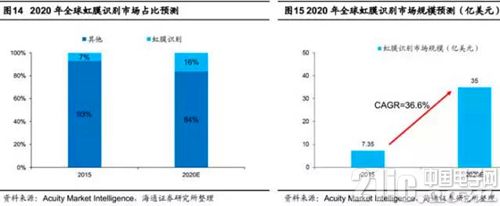 根據(jù)美國智庫Acuity Market Intelligence的報告顯示,虹膜識別在手機、平板電腦等消費級終端市場規(guī)模將增長的更快。預計 2020年全球生物識別市場將達到 218.7億美元,其中虹膜識別技術占全球生物特征識別的市場份額,將從2015年的7%提升至2020年的16%,2020年的總產(chǎn)值將達到35億美元,對應復合年均增速為36.6%。