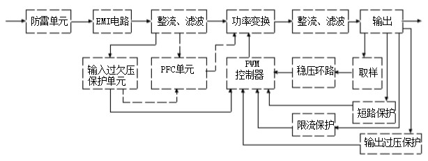 開關(guān)電源模塊主要電路是由輸入EMI、整流濾波電路、功率變換電路、PWM控制器電路、輸出整流濾波電路等組成。詳細如下圖所示: