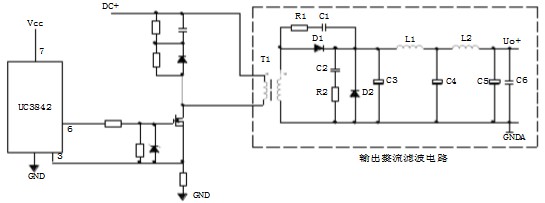 C1、L1、C2組成輸入濾波電路,跟上述的AC輸入濾波電路的作用是一樣的,R1、R2、R3、Z1、C6、Q1、Z2、R4、R5、Q2、RT1、C7組成抗浪涌電路。在起機的瞬間,由于C6的存在Q2不導通,電流經(jīng)RT1構(gòu)成回路。在起機的瞬間電流在RT1上產(chǎn)生的壓降增大,Q1導通使Q2沒有柵極電壓不導通,RT1將會在很短時間燒毀,以保護后級電路。