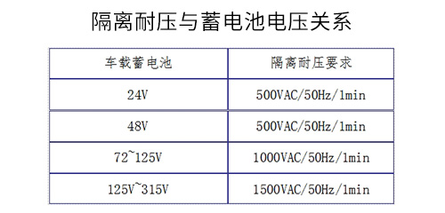 車載電子設(shè)備的介電試驗(yàn)(耐壓試驗(yàn))的試驗(yàn)電壓與車載蓄電池的供電電壓相關(guān),對(duì)于車載電子設(shè)備的供電類型不確定的話,如110V蓄電池可能浮沖至125V以上情況出現(xiàn),或低壓變壓器可能會(huì)產(chǎn)生大于125V電壓,建議采用1500VAC隔離的使用要求,可滿足瞬時(shí)過(guò)電壓時(shí)的電氣隔離要求。其相關(guān)要求如下: