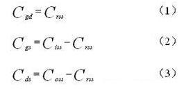 帶外接電容C2的N型MOS管極間電容等效電路MOS管的極間電容柵漏電容Cgd、柵源電容Cgs、漏源電容Cds可以由公式確定,公式中MOS管的反饋電容Crss,輸入電容Ciss和輸出電容Coss的數(shù)值在MOS管的產(chǎn)品技術(shù)手冊上可以查到。公式如下: