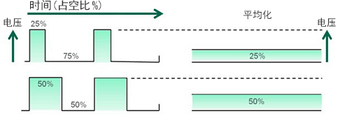 上圖是利用代表性的控制方式PWM(Pulse Width Modulation:脈沖寬度調(diào)制)方式加以降壓的原理。PWM是指讓周期(頻率)保持恒定,調(diào)整ON和OFF的時間比,也就是占空比來進(jìn)行控制的方法,能運(yùn)用在開關(guān)電源、電源模塊等多種應(yīng)用上。采用PWM時,經(jīng)由開關(guān)將DC電壓轉(zhuǎn)換成達(dá)到必要占空比的AC后,接著再進(jìn)行整流回到DC,以取得想要的DC電壓。例如經(jīng)由開關(guān)將100VDC轉(zhuǎn)換成周期25%ON、剩下OFF的25:75的AC。接著,整流-平滑該AC,也即將其均勻化后轉(zhuǎn)換成DC,電壓就會轉(zhuǎn)換成相當(dāng)于25%的25VDC。