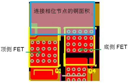 上圖所示為將頂部和底部分立MOSFET并排連接時的銅軌道,這是可將電機(jī)繞組連輕松連接到PCB的常見布局之一。連接相位節(jié)點的銅面積的長度為寬度的兩倍(軌道寬度取決于電流,軌道寬度通常受電路板的外形尺寸限制)?;蛘吣梢陨舷屡帕许攤?cè)和底側(cè)分立MOSFET,保持在相位節(jié)點之間。但是由于需要提供將電機(jī)繞組連接到相位節(jié)點,您可能無法減少軌道長度,并且這種布置可能不適合所有應(yīng)用。