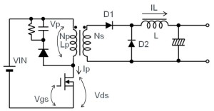 正激式只會(huì)單向激磁變壓器,在晶體管為OFF時(shí),必須釋放(復(fù)位)蓄積在變壓器的電能。也因此必須裝上復(fù)位(緩沖)電路,圖中位于變壓器一次側(cè)的RCD。復(fù)位電路一般是由電阻/電容器/二極管組成,但基本上仍會(huì)損耗電能,因此變壓器的利用效率也不算高。而在啟動(dòng)復(fù)位后,會(huì)施加DC輸入電壓1.5~2倍的電壓至開關(guān)用晶體管上,圖中的Vp和Vds的波形VR。最近能量,損耗和Vds,該電壓經(jīng)由緩沖的電阻和電容器轉(zhuǎn)換??梢?span>結(jié)合主動(dòng)箝位電路,通過再生必須復(fù)位的電能,減輕損耗和Vds。