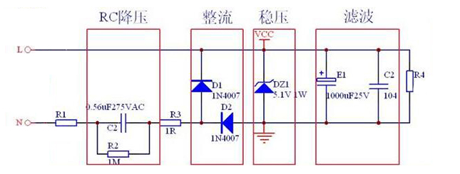 AC-DC電源阻容降壓電路由降壓-整流-穩(wěn)壓-濾波組成,在電路設(shè)計(jì)時(shí),應(yīng)先確定負(fù)載最大工作電流,通過(guò)此電流值計(jì)算電容容值大小,從而選取電容。與線(xiàn)性變壓器電源的區(qū)別是阻容降壓電源是通過(guò)負(fù)載電流選定電容,而線(xiàn)性變壓器電源是通過(guò)負(fù)載電壓和功率選定變壓器。